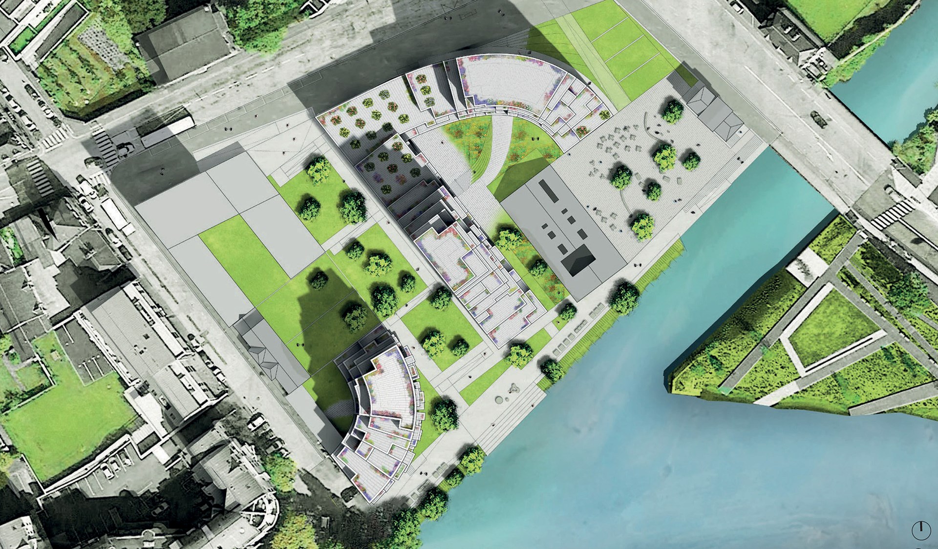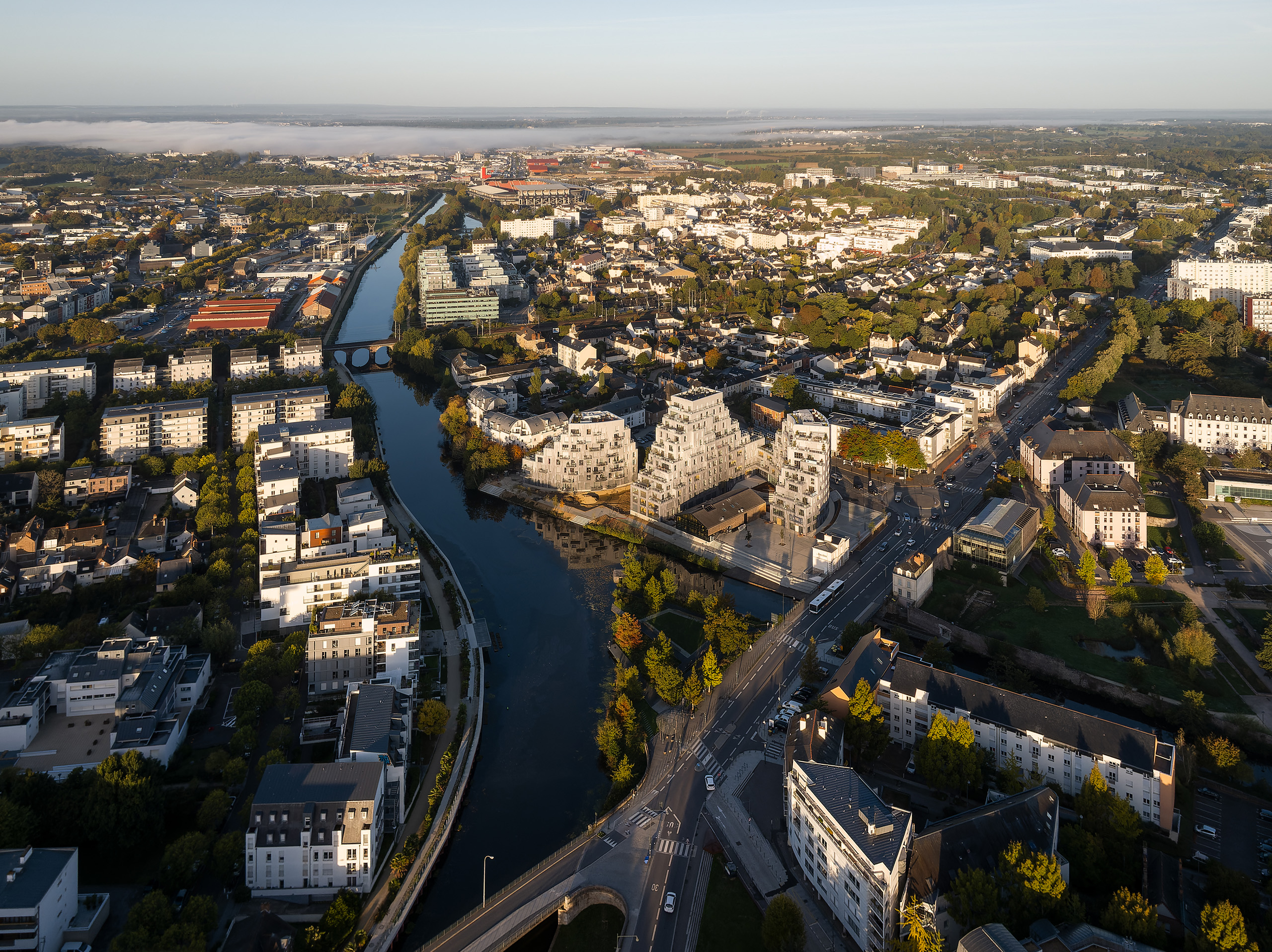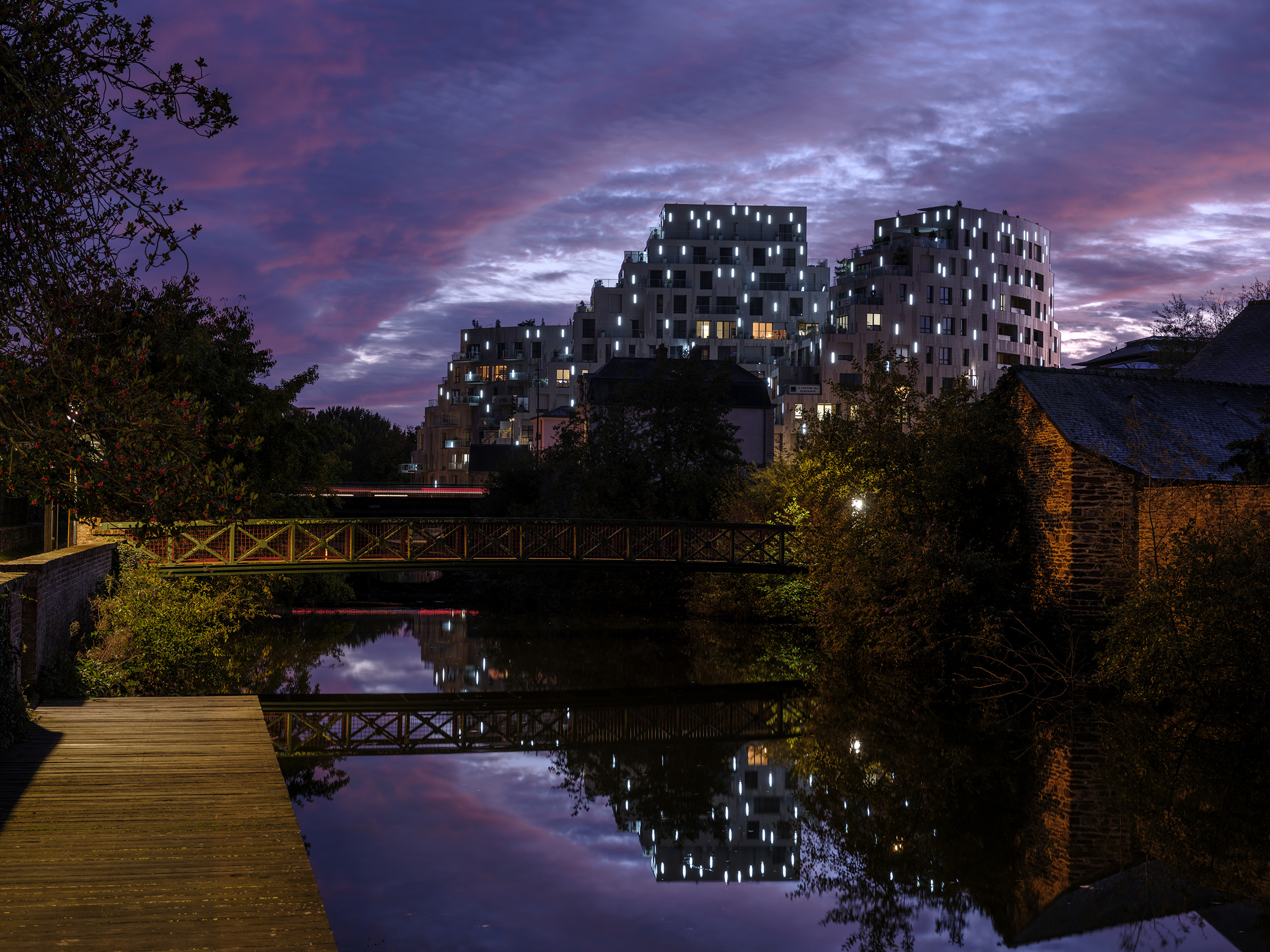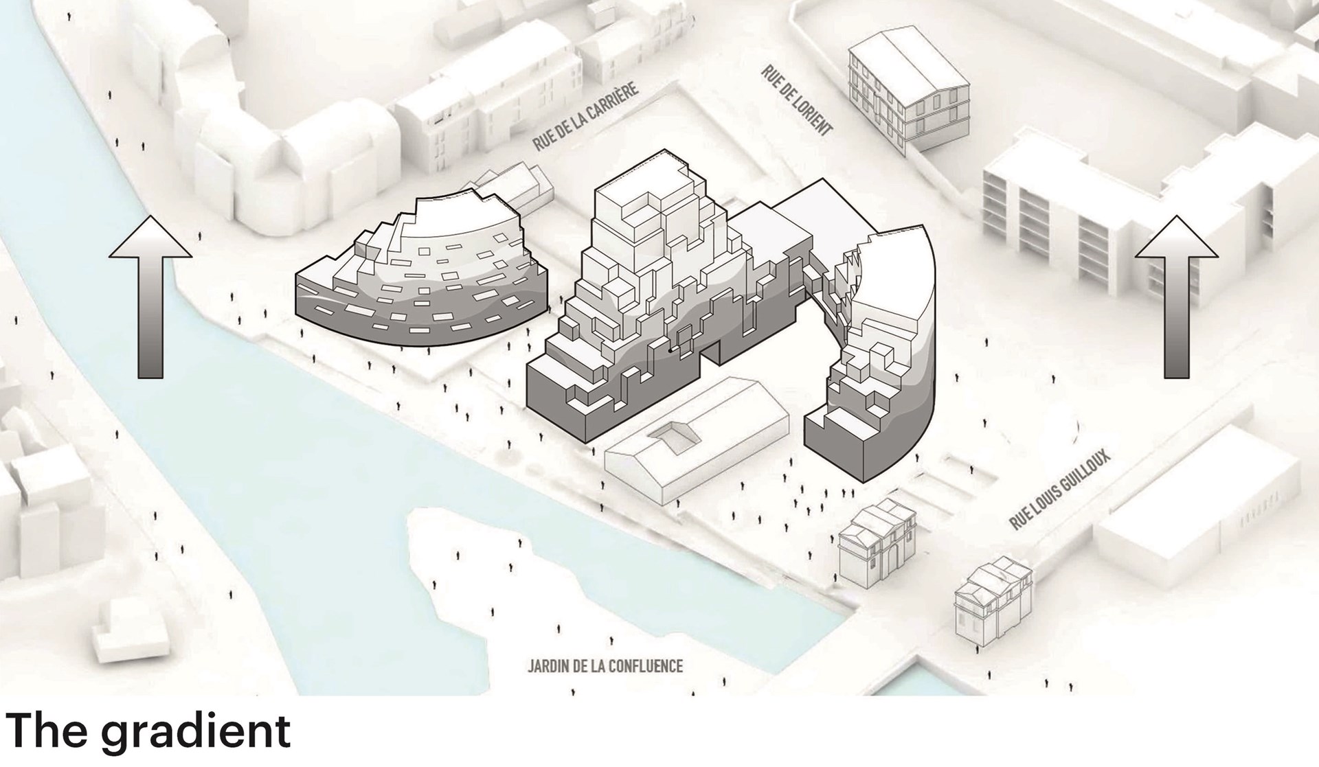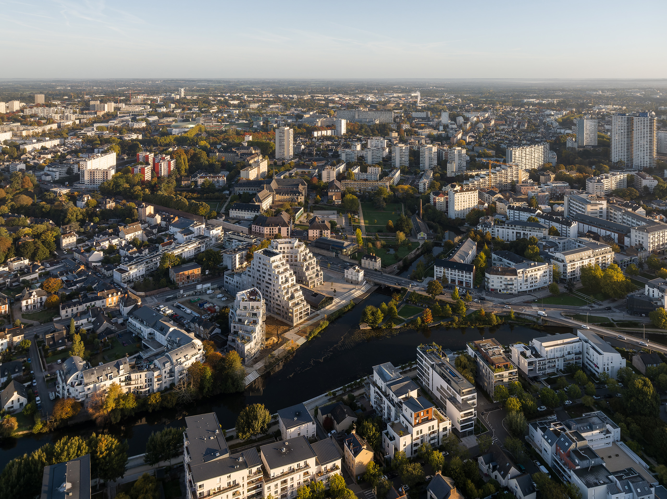 In 2018, French magazine l’Express called Rennes the most liveable city in France and, combined with the arrival of a new TGV connection in 2017, this attractiveness has led to a continued population growth. The many heritage buildings in the city’s centre have shifted this expansion pressure outwards, requiring the periphery to grow either outwards into the countryside or – preferably – upwards with a pleasant approach to densification. Positioned precisely where the Ille River joins the Vilaine, across from the green floating park of the Jardin de la Confluence, at the end of the now-pedestrianised thoroughfare of Mail François Mitterrand, Ascension Paysagère’s highly visible location required an exemplary approach to this perimeter densification.