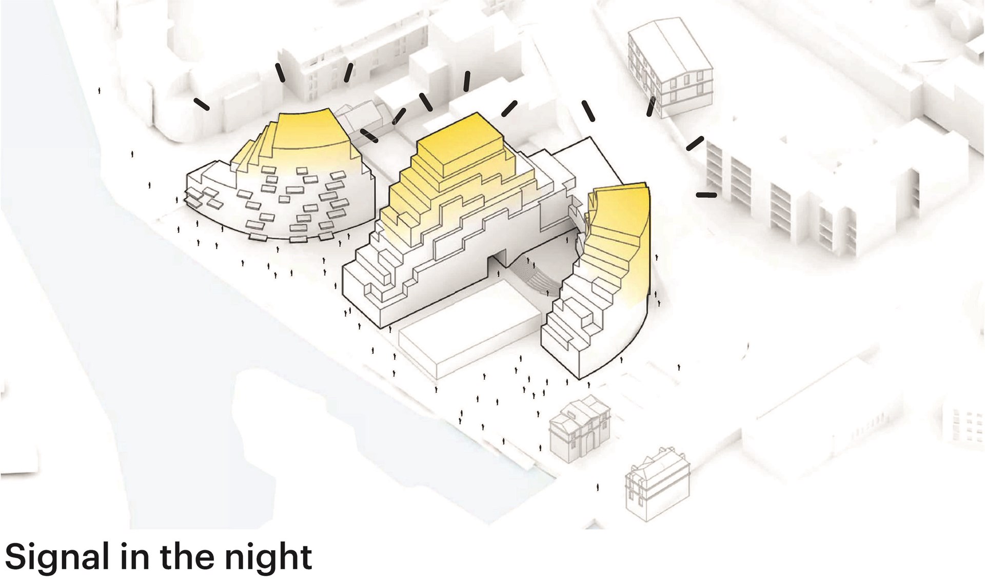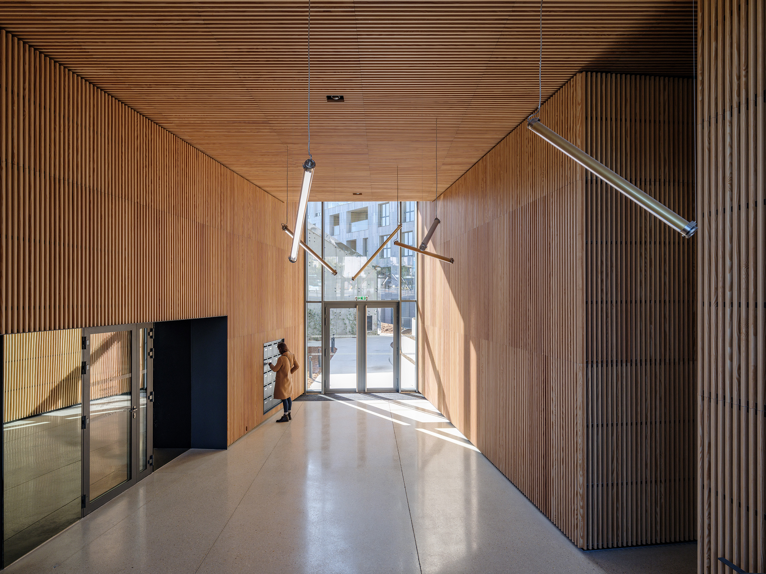 Every apartment is provided with an outdoor space – either a terrace, a balcony, or a loggia. Each of these comes complete with custom plant pots fitted with automatic irrigation as well as a dedicated water tap to help residents care for their piece of the landscape. The terraces create a village-like atmosphere that allows residents to greet their neighbours above and below. At ground level, the curves of the buildings define a series of public spaces, with a green pedestrian street between the two blocks and a plaza at the water’s edge that leads to Le Bacchus, a restaurant and theatre that is embraced by the curve of the larger building. The entrances to the larger building are found in three inviting, wood-clad passages that punch through the building, creating generous meeting spaces and providing views and access to a secluded garden at the rear of the theatre-restaurant. At the entrance to the site a former renovated tax office is included in the urban plan, making the public square a mix of three architectural periods.