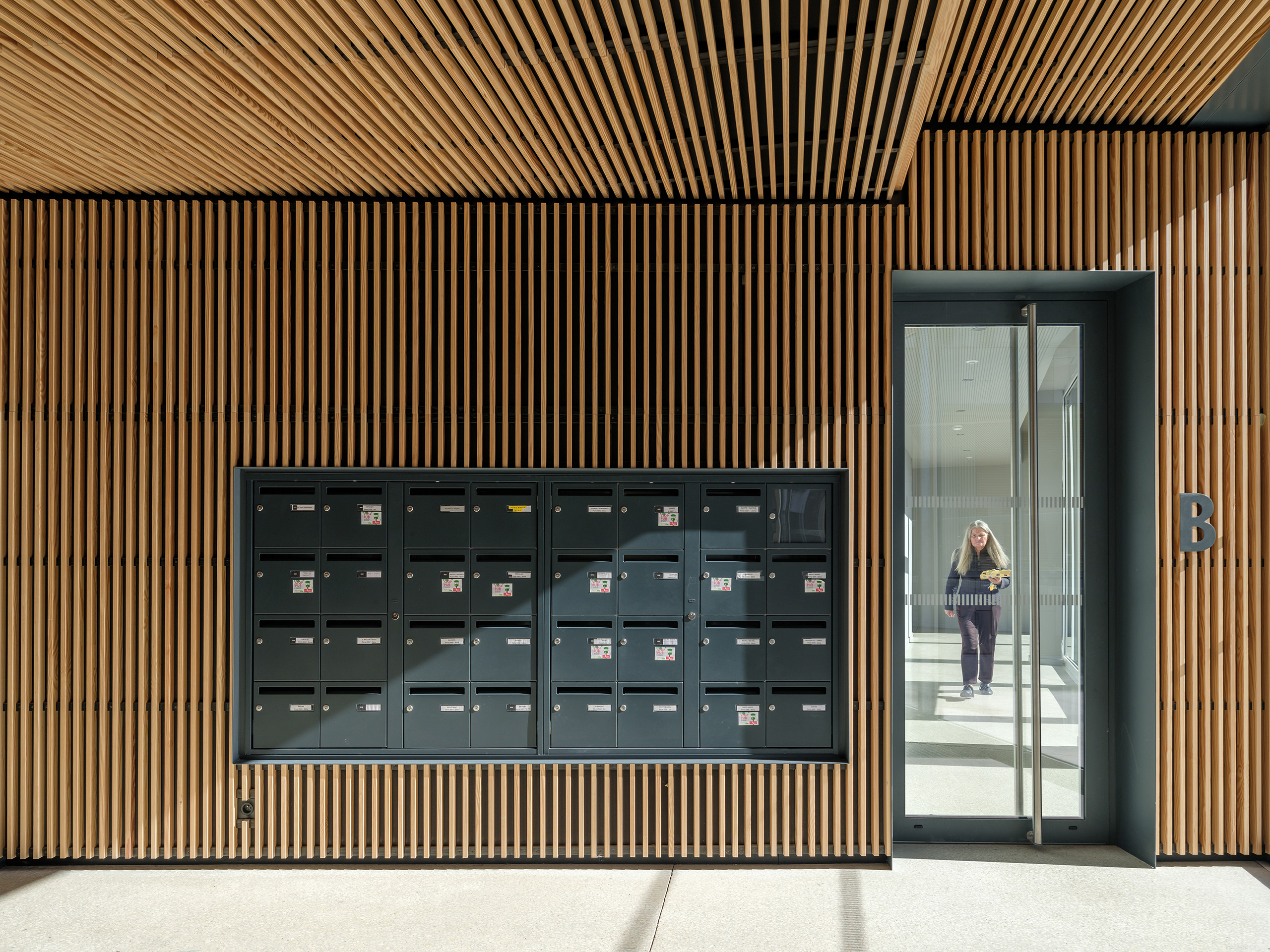 The project uses a variety of approaches to ensure sustainability and social responsibility. Densifying an urban area reduces the city’s need to expand into the surrounding landscape, and the parking garages include a total of 210 square metres for bicycle parking, including dedicated spaces for cargo bicycles and electric charging stations to encourage more sustainable transport options. The 34 apartments in the smaller building are completed to Passivhaus standards, giving them the potential to use dramatically less energy than typical apartments. Many of the apartments are double or even triple aspect, with windows on multiple sides of the building to allow cross ventilation and excellent natural light conditions inside.