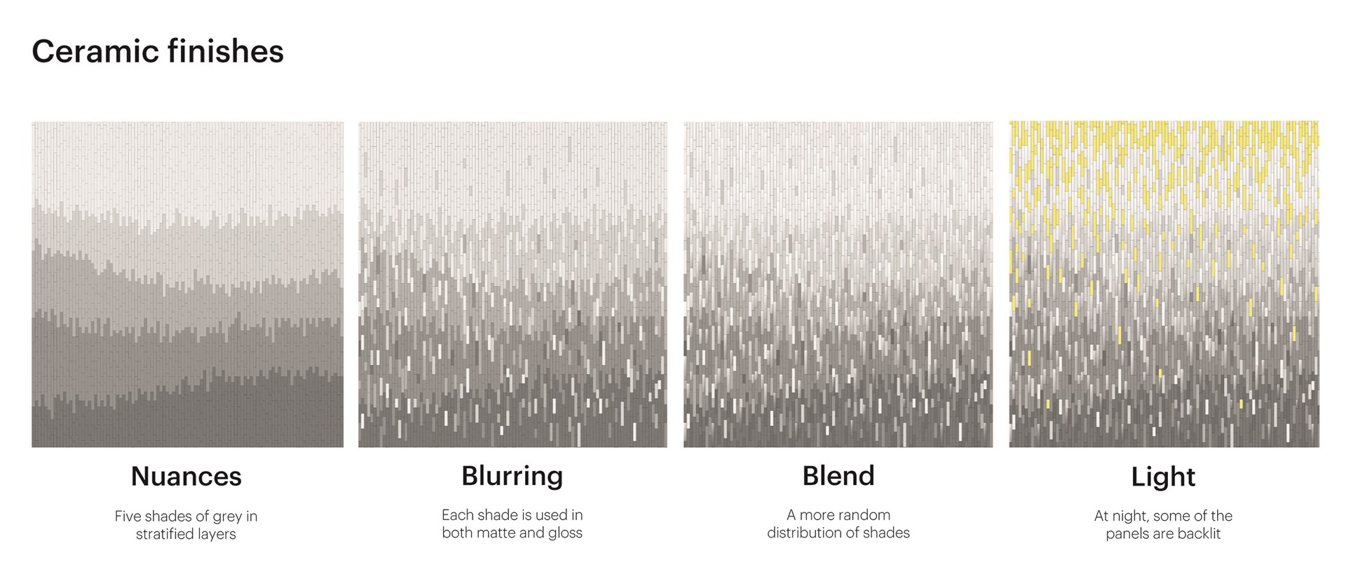 The façade reinforces the connection to geology. It features both matte and glossy ceramic panels in five different tones of grey, arranged into stratified layers: dark and mostly matte near to ground level, and lighter and glossier at the top levels. At night, lighting reinforces this effect, with more lights integrated into the ceramic panels at the top of the building. As a result, the design seems as if it truly belongs – an outgrowth of the environment itself, which feels natural even as it significantly densifies this part of the city.