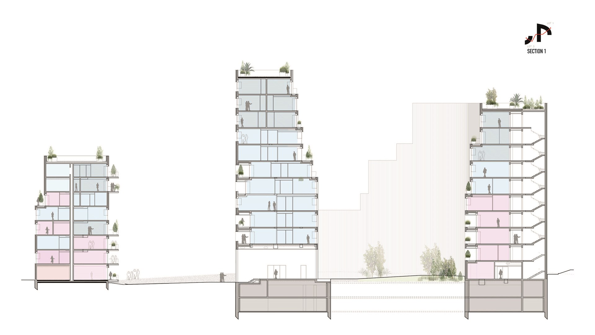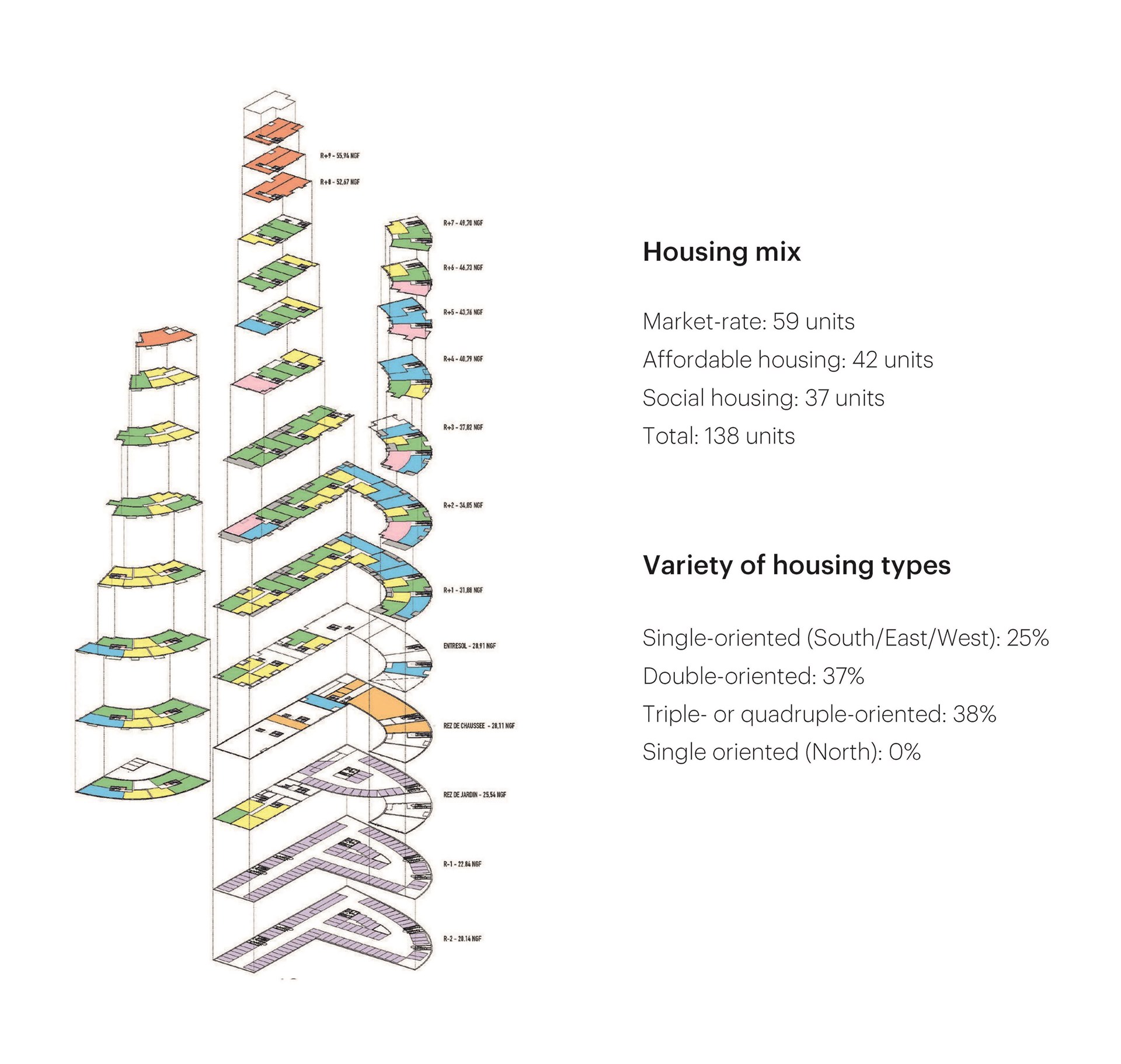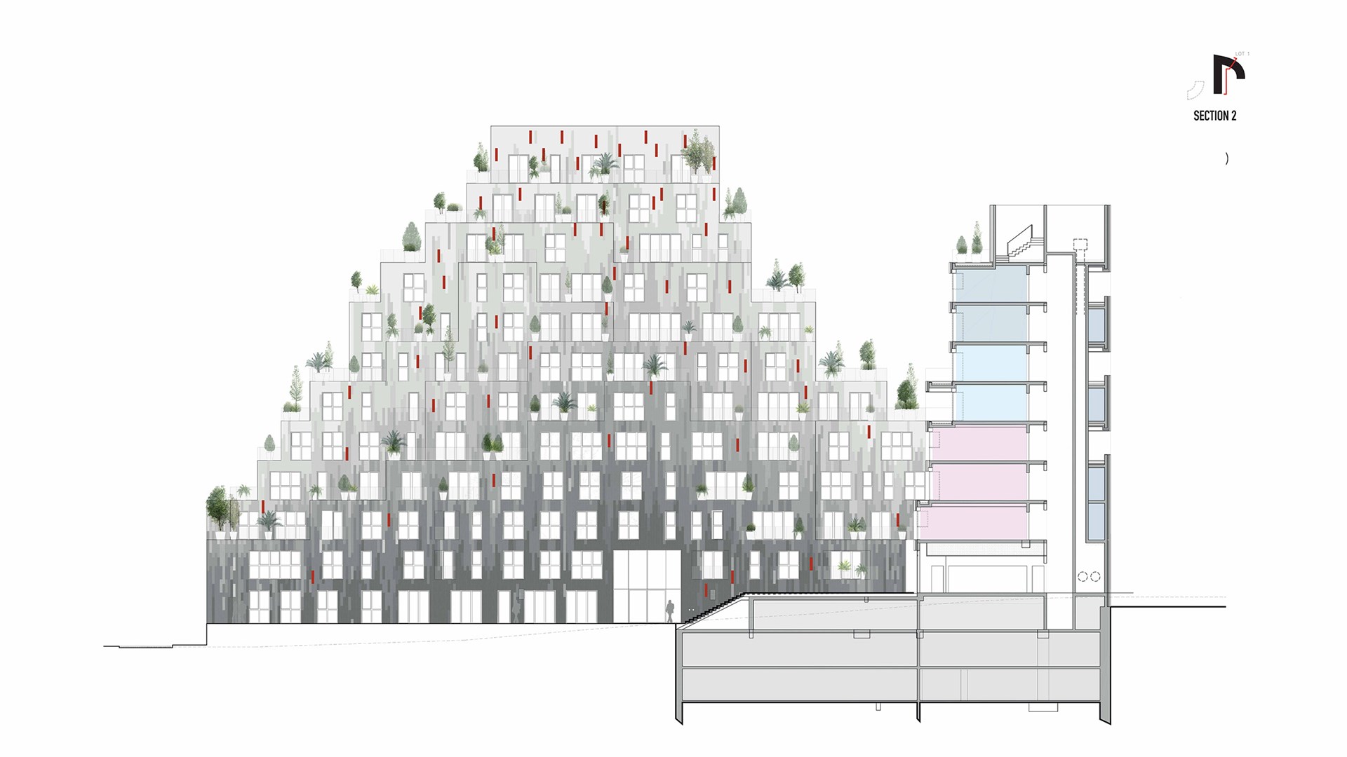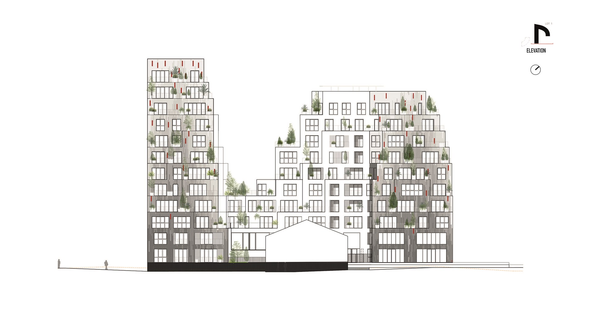 “In Ascension Paysagère, we have delivered a project just as we hoped it would be, and exactly what is needed in this location”, says MVRDV founding partner Nathalie de Vries. “With the river and the park opposite, the site offers a wonderful location for people to live. The challenge was to allow as many people as possible to live here without destroying those qualities. We do this by creating an ensemble of two buildings with silhouettes like small hills, covered with terraces and balconies to allow the inhabitants nice outdoor spaces that are already provided with large pots for plants and trees.”