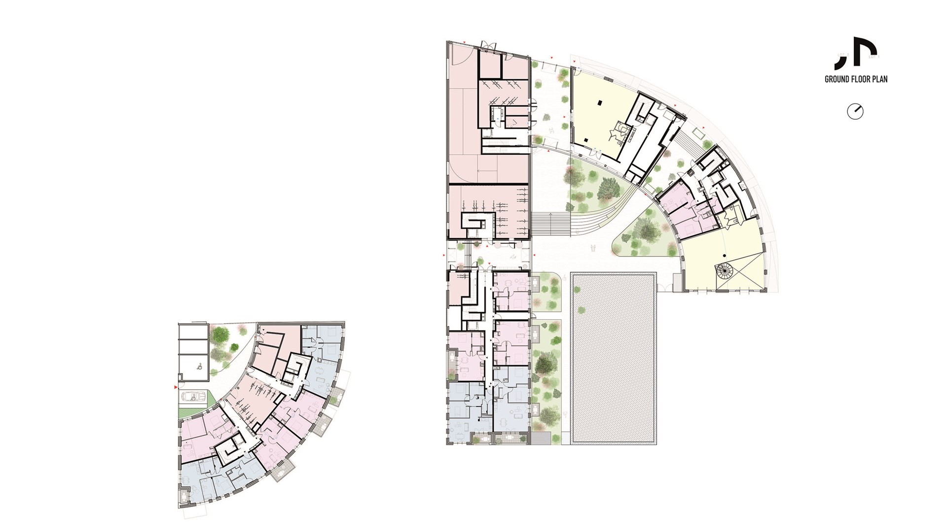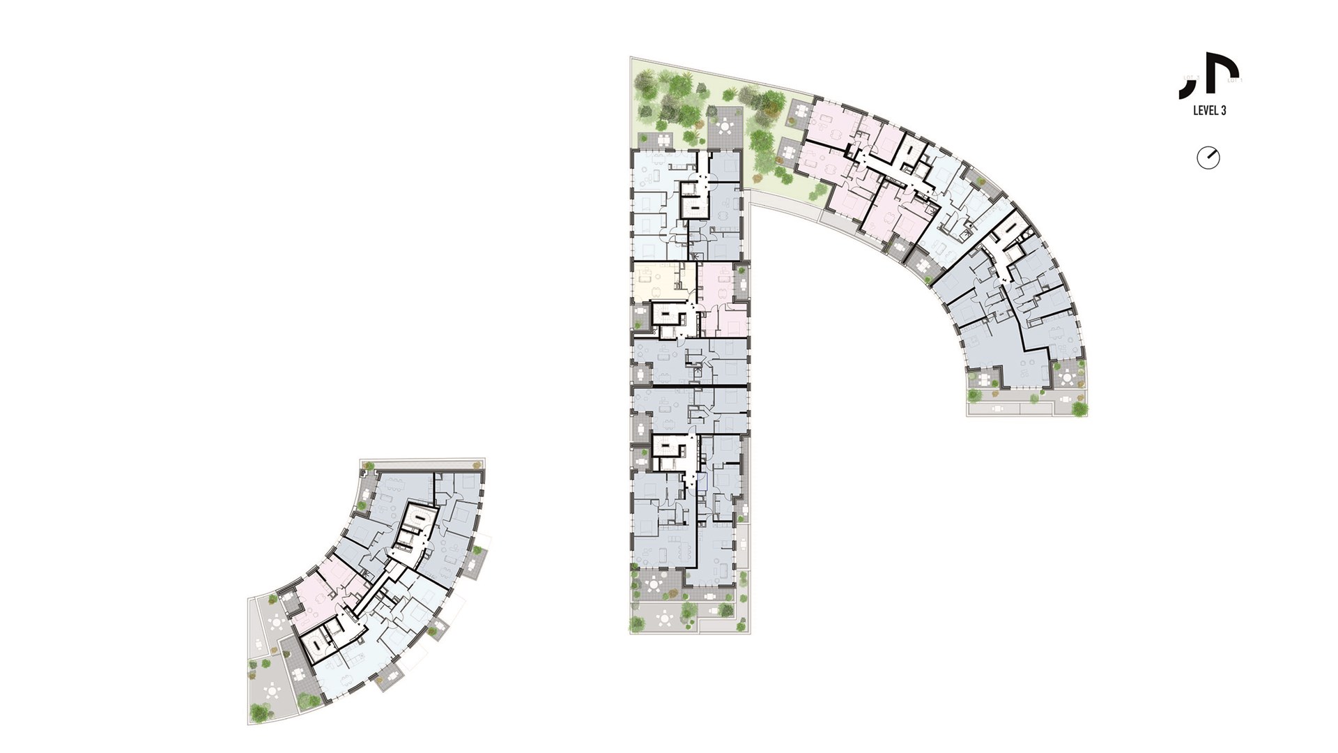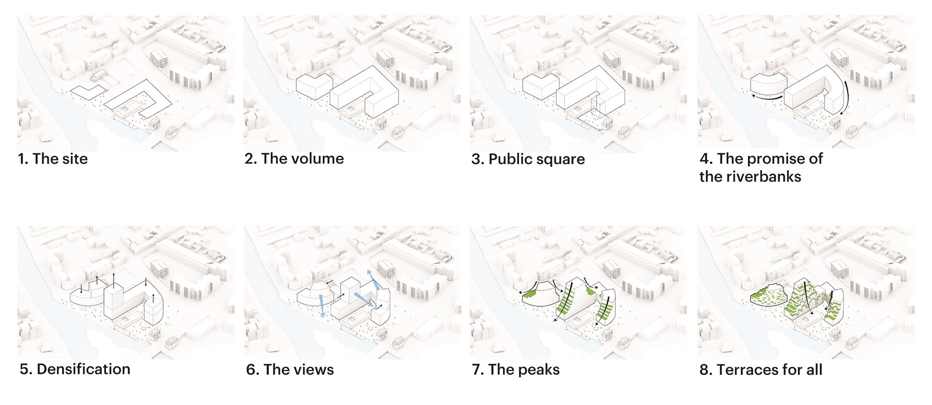 Ascension Paysagère takes inspiration from geological formations. The project comprises two curving buildings, one large and one small, with gradually receding slopes. By the river, and at points where the project approaches its neighbours, the buildings are low, acknowledging the expansive, low-rise context. Elsewhere, however, the design gradually steps up into three peaks, reaching the maximum 12-storey height in the centre of the site. The terraces created by these gradual step-backs are decked with pots filled with greenery, extending the lush atmosphere of the riverbank upwards to the apartments even at the very top of the building. On the western corner of the larger block, in between the building’s two ‘peaks’, a garden including fruit trees emphasises this green approach.